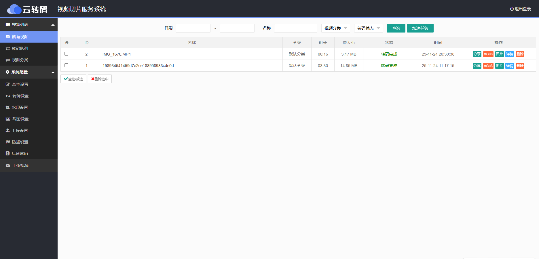 这款系统源码的特点是能够快速转码和切片视频,同时支持多种格式的视频文件。在自己的网站上传的视频将会被自动切成ts格式使用m3u8播放器播放。这个版本在原来的基础上修复了m3u8链接插入外部网站提示无法播放问题,没修复的只可以手动打开m3u8链接播放,插入网站无法使用。